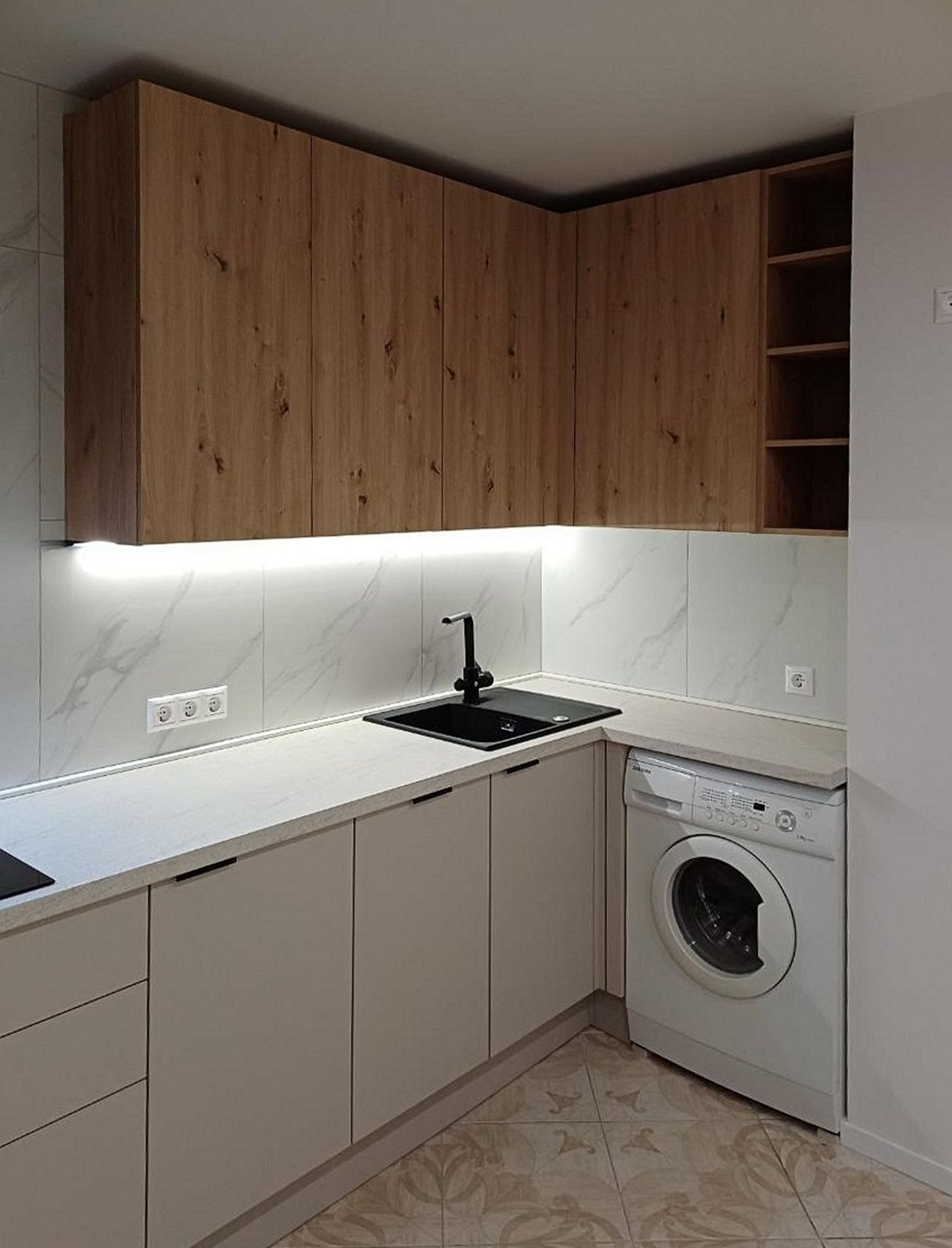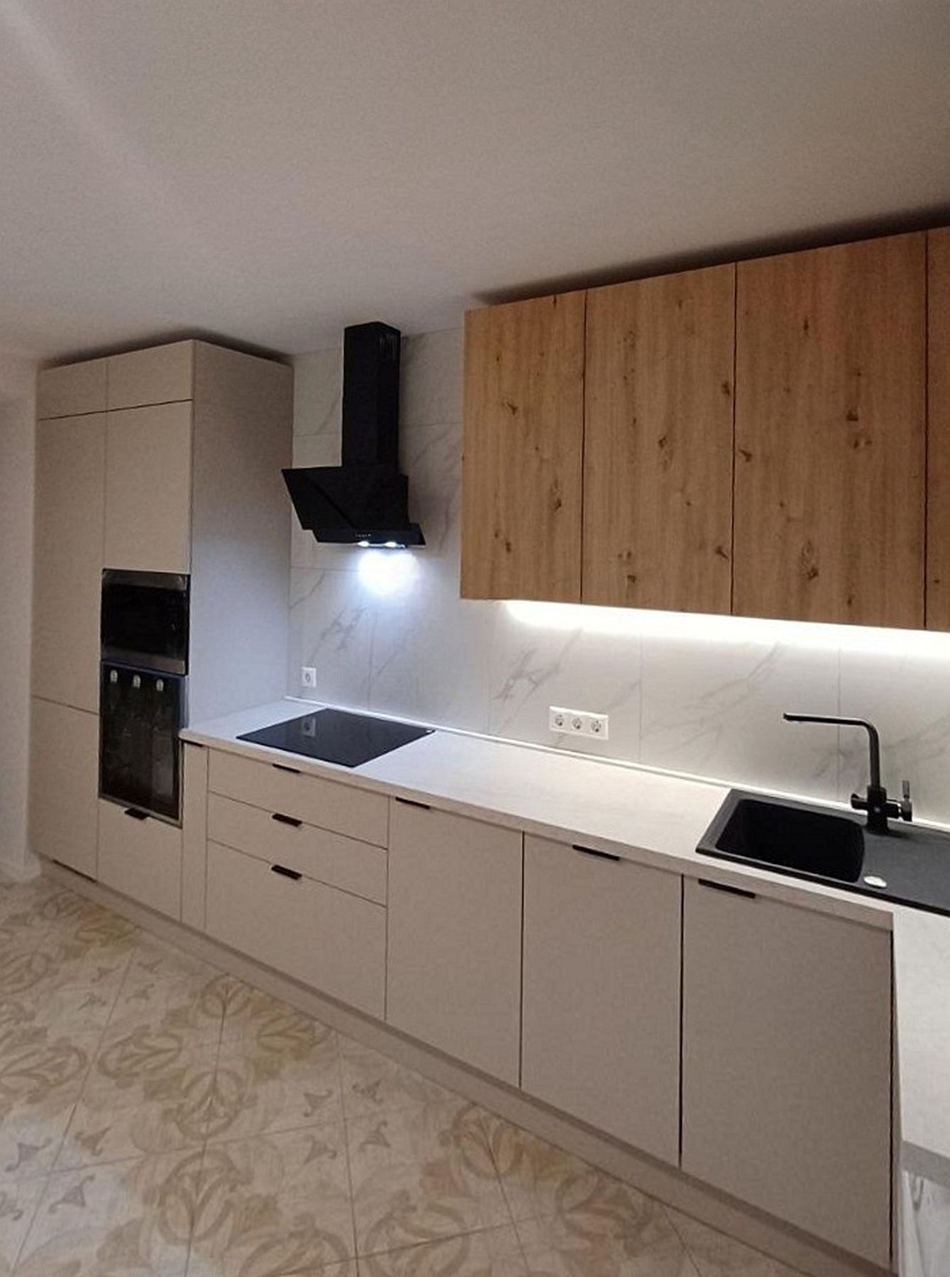 Ключевой прием – гармоничный контраст. Фасады цвета "кашемир" сочетаются с фасадами древесного цвета, создавая мягкую и привлекательную основу. Яркий акцент придает черная техника: варочная панель, духовой шкаф и вытяжка. Все коммуникации и бытовые приборы скрыты, обеспечивая визуальный порядок и удобство в ежедневной эксплуатации.